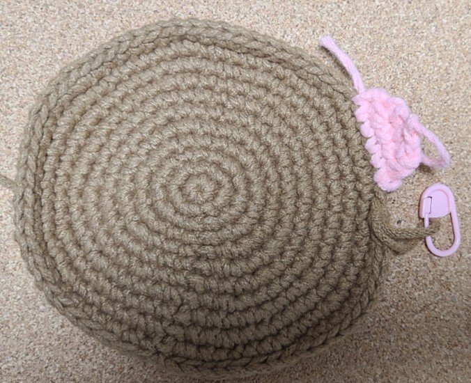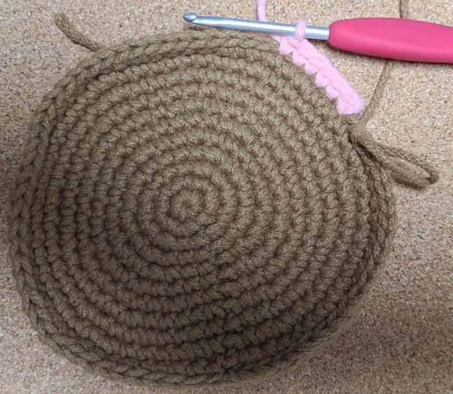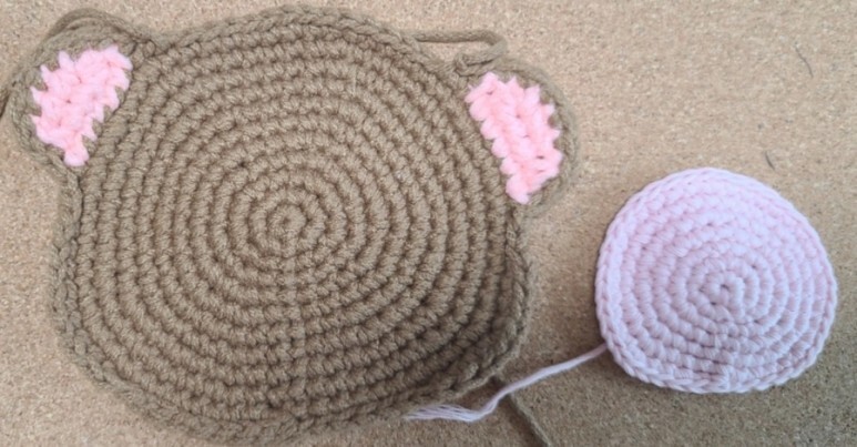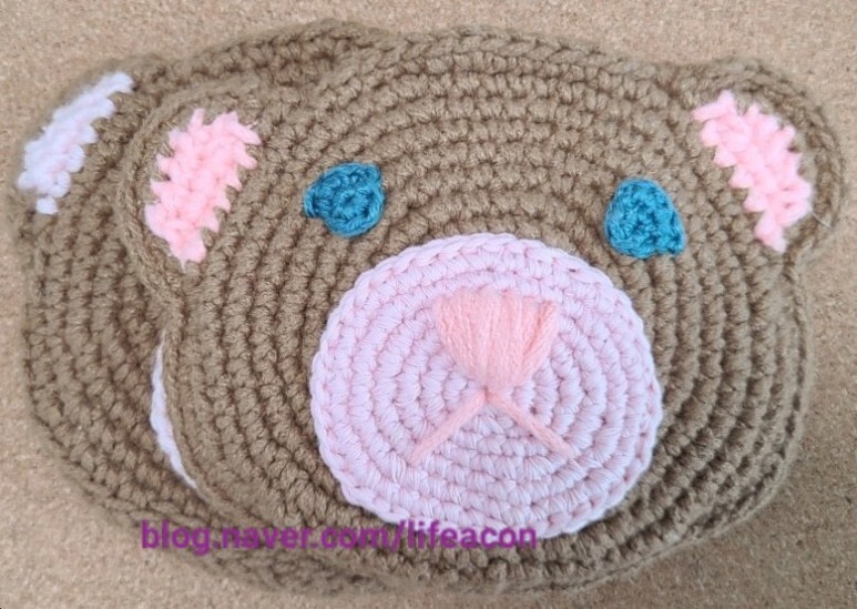 얼굴의 아랫부분은 빼뜨기로 해주시고 볼 부분은 짧은 뜨기로 해주세요 귀 부분을 가기 전에 빼뜨기로 하다가 귀 부분은 분홍색 실로 떠주었어요
